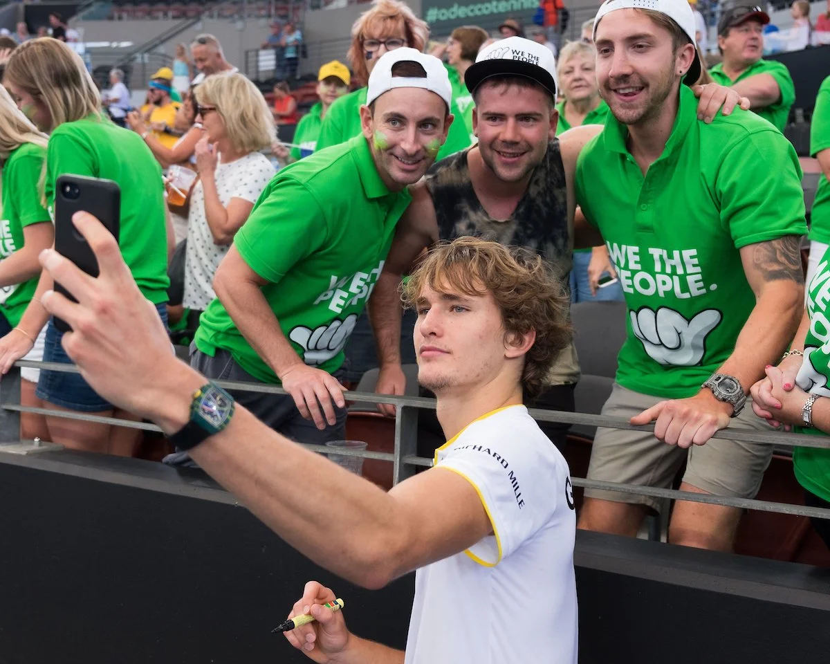 Alexander Zverev nach seinem 5- Satz Sieg gegen Alex de Minaur mit australischen Fans.